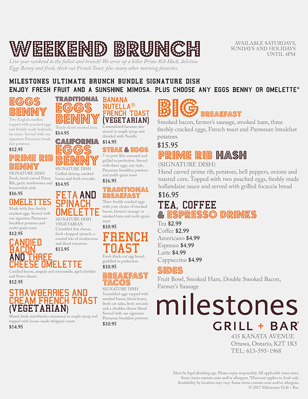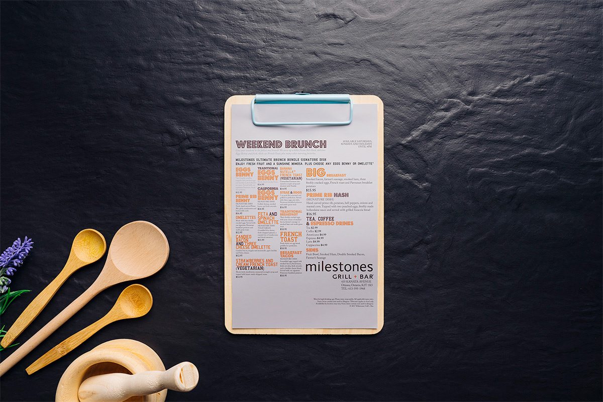 Milestones is a new Canadian restaurant, they offer comfort food and bar service. Hence, that encourages me to use different types of fonts to express their diversity. The colours used is based on their logo.